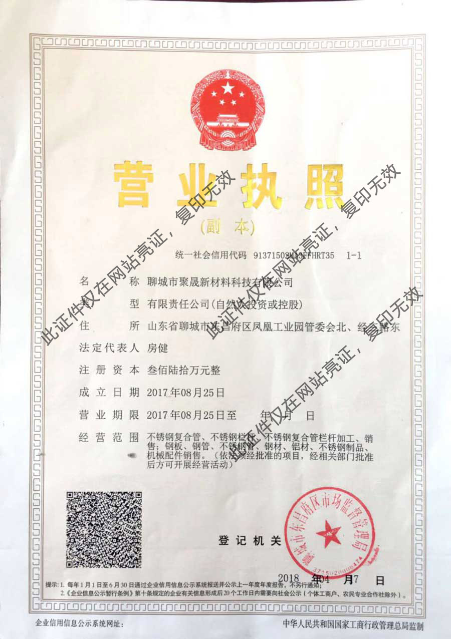 聊城市聚晟新材料科技有限公司是集設計、生產、銷售、安裝于一體的專業不銹鋼橋梁防撞護欄廠家,公司主營:橋梁護欄、 不銹鋼護欄、 不銹鋼護欄欄桿、 不銹鋼防撞護欄 、橋梁護欄、橋梁防撞護欄、不銹鋼橋梁護欄、橋梁欄桿 、河道護欄、防撞欄桿、河道欄桿、 燈光護欄、燈光欄桿、景觀護欄、景觀欄桿、棧道護欄、棧道欄桿、 304不銹鋼復合管、不銹鋼復合管護欄、201不銹鋼復合管、不銹鋼碳素鋼、不銹鋼復合管等產品,公司成立以來一直把確...